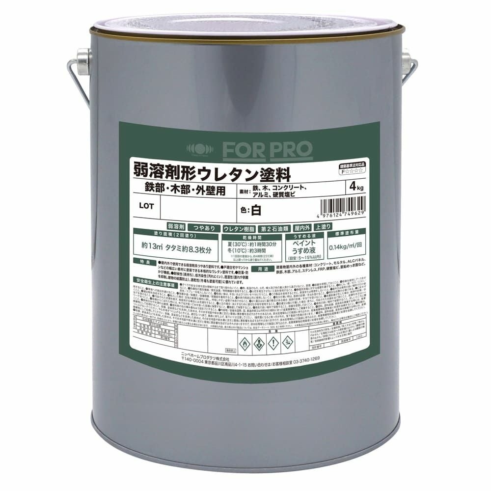 他の画像を見る ターペン可溶1液反応硬化形ウレタン樹脂塗料 業務用 屋内外 防藻・防かび 弱溶剤塗料FOR PRO 弱溶剤形ウレタン塗料 4kg 白 当店特別価格 ¥ 6,980 税込 塗料用シンナーで希釈できる、使いやすさを追求したウレタン樹脂エナメル カートに入れる お気に入りに登録する