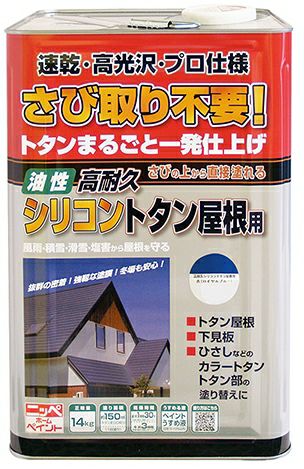 さびの上から直接塗れる、トタン用の高光沢塗料です。1回塗りで仕上がりますので作業性が抜群です。指定可燃物の為、消防法対応商品です。シリコン系高密度樹脂が水と酸素をシャットアウトし、さびの進行を抑え、長期間素材を紫外線の劣化、さびから保護します。特殊シリコン樹脂により長期に渡り素材を保護します。強靭な塗膜が、風雨、積雪・滑雪・塩害など、厳しい自然環境からトタンを守ります。乾きが早いので、結露によるつやびけや白化に強い塗料です。