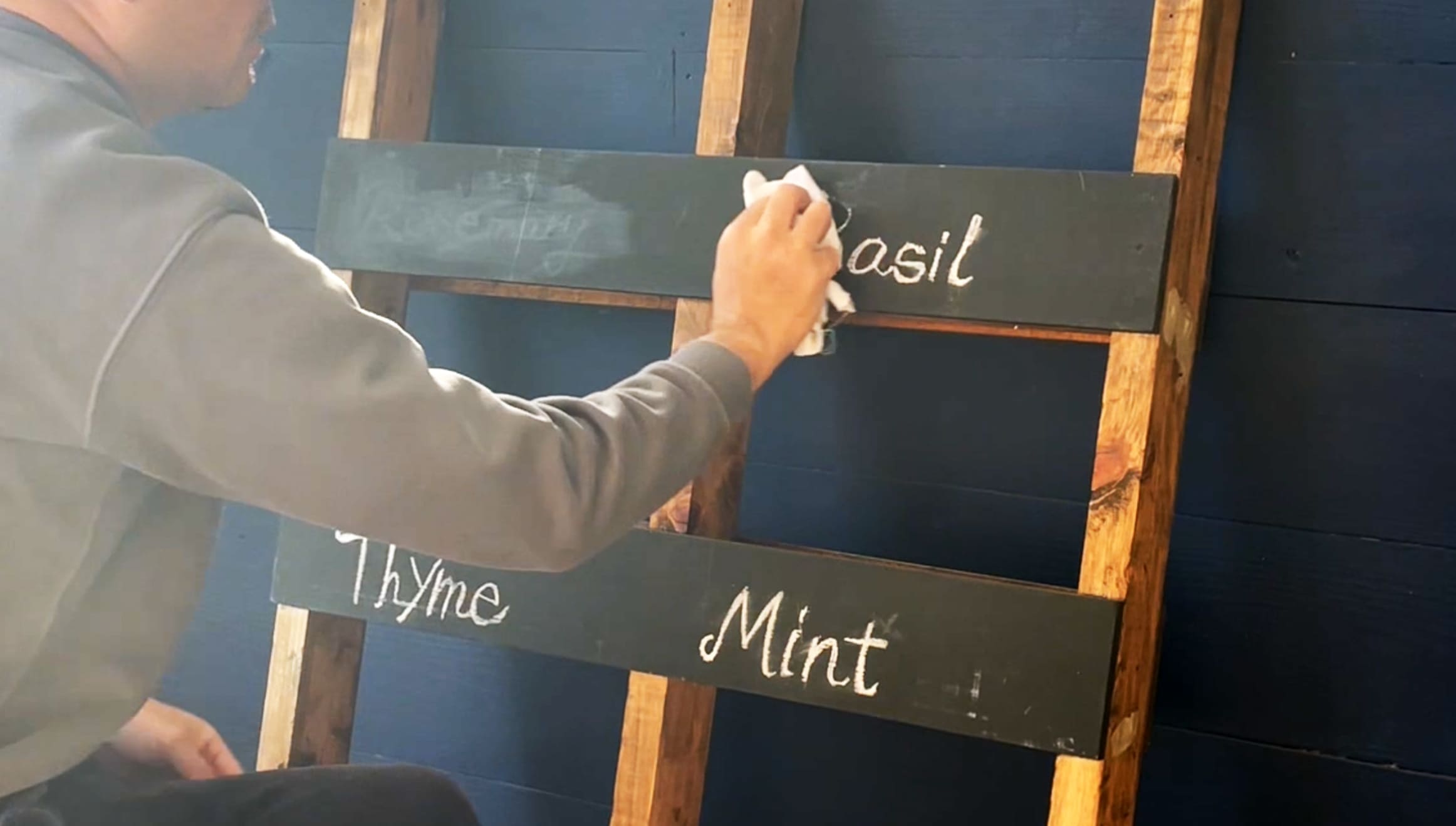 つや消しのペンキ(カモフラ ペイント)上にチョークで植物の名前を書いてましたが、
