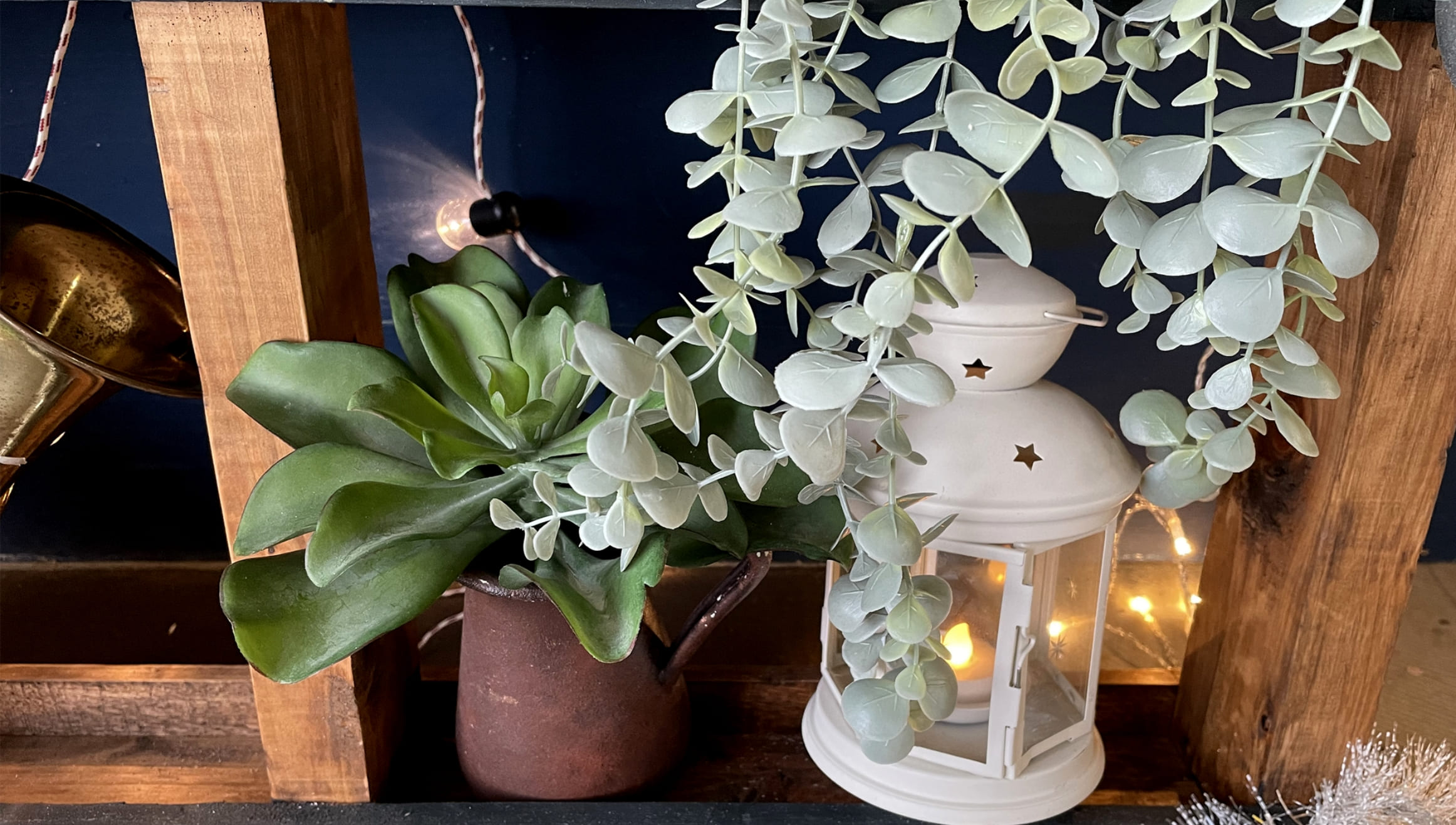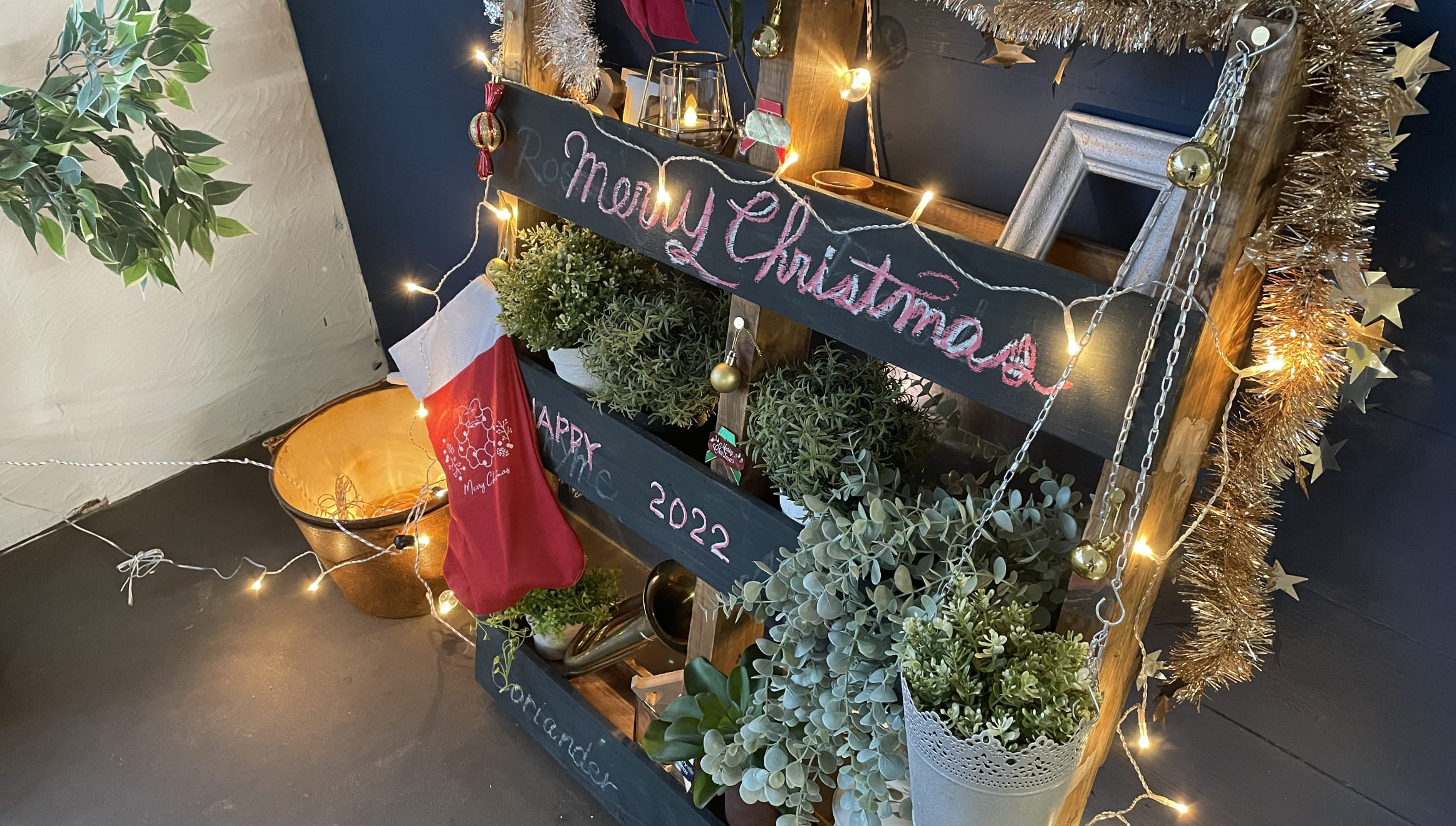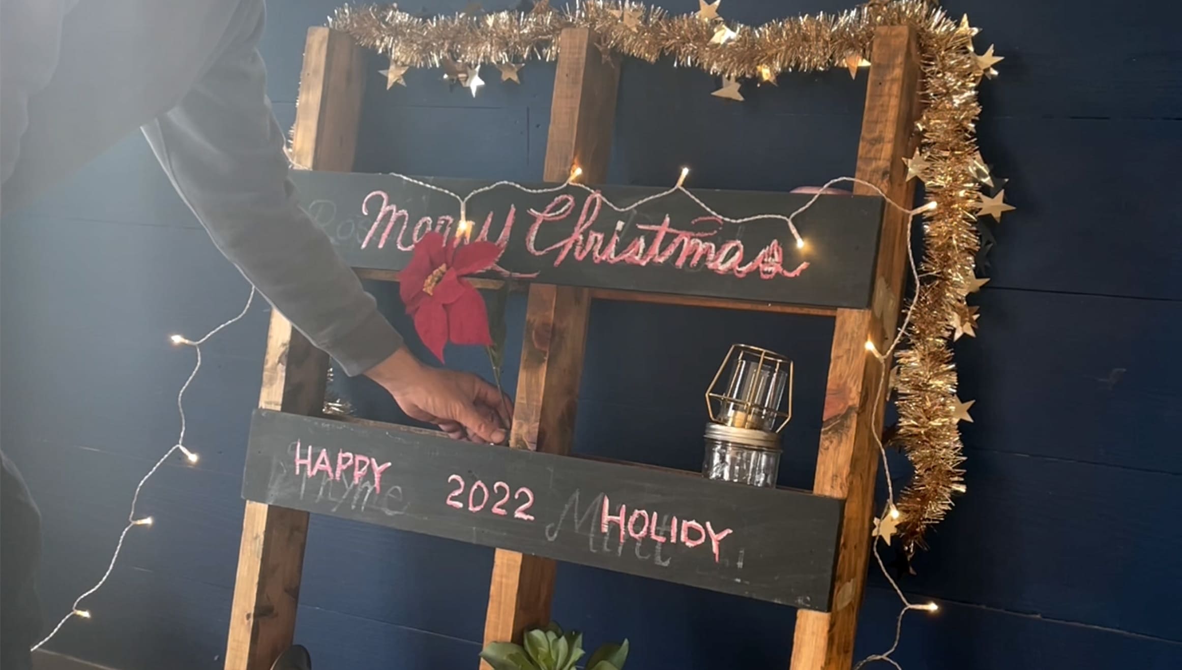パレットプランターをクリスマスデコレーションページ。ニッペホームプロダクツが提供するパレットのクリスマスデコレーションページです。100均で購入したクリスマス装飾品を使用して無機質なパレットプランターをクリスマスイメージにデコレーション。使用した塗料、パレットも合わせてご紹介。