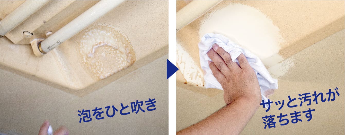 スプレーした泡が、汚れを強力に溶かしながら消えてゆき、拭き取るだけで、汚れが落ちます。
