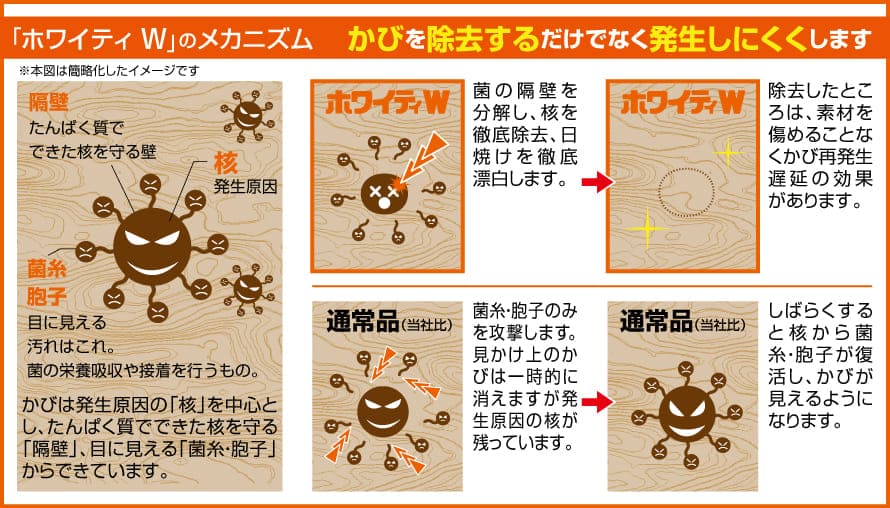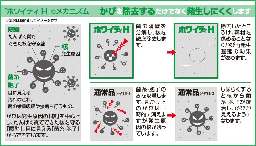 洗浄だけでは落とせない「カビによる黒ずみ」をきれいに除去します。