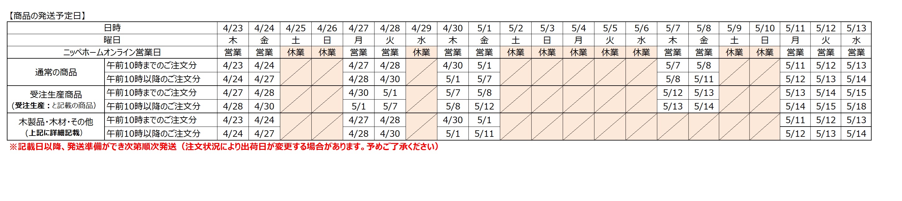 【GW休業前の発送予定日】
