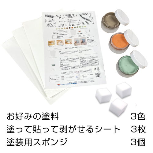 • 「塗って貼って剥がせるシート3枚」「お好みのナチュラルアースカラー3色」「塗装用スポンジ3個」がセットになった、カラーサンプルセットです。