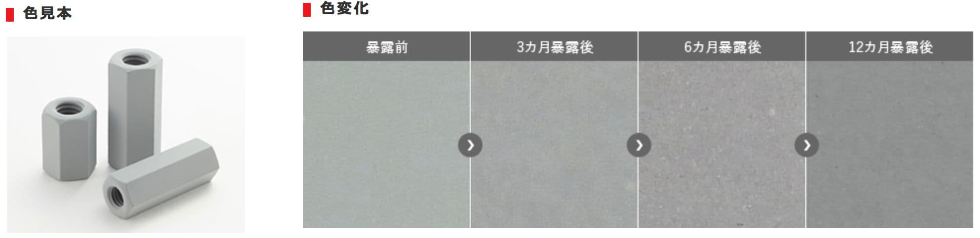 - 溶融亜鉛めっきと同様に、暴露されるにしたがい色が変化。塗膜中の亜鉛が酸化することでさび止め効果を発揮、鉄を守ります。時には色ムラのような現象が発生しますが、通常は3〜6ヶ月でほぼ均一になり、最終的にはめっきと同様の色調に落ち着くので補修箇所が目立たなくなります。