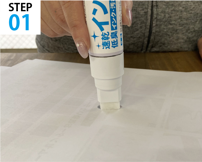 ①手袋やウェスなどで手に液が付かないようにペン先を引き抜きます。