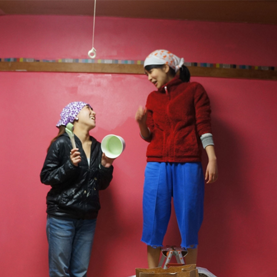 壁を大きなキャンパスに見立てて、自由に好きな色で描きましょう。