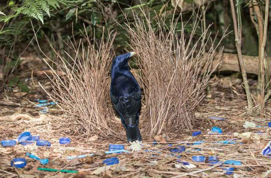 オーストラリアの固有種である「アオアズマヤドリ」の雄は、鮮やかな青色の飾りが大好き。繁殖期になると、雄は雌にプロポーズするため、東屋(小屋のようなもの)を作り、青色の物を集めて回り、東屋の周りに並べて飾り付けます。